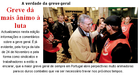 Actualizamos nestas páginas alguns comentários e informações sobre a greve geral. À hora do fecho desta edição, a CGTP-IN iria divulgar as conclusões da reunião de anteontem do seu Conselho Nacional. Pela força da luta de 24 de Novembro e pela forma como sindicatos e trabalhadores a estão a encarar, a maior greve geral de sempre no nosso país abre perspectivas muito animadoras para os duros combates que vai ser necessário travar nos próximos tempos.
