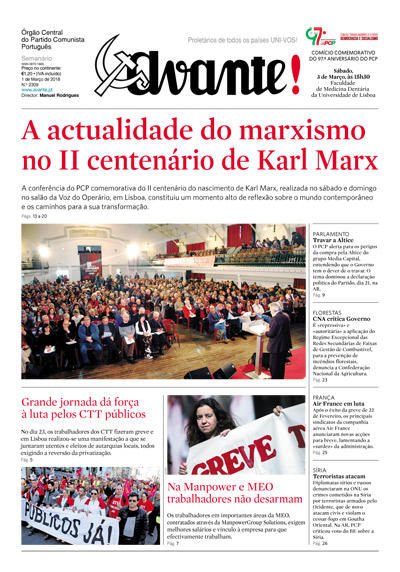 A actualidade do marxismo no II centenário de Karl Marx A conferência do PCP comemorativa do II centenário do nascimento de Karl Marx, realizada no sábado e domingo no salão da Voz do Operário, em Lisboa, constituiu um momento alto de reflexão sobre o mundo contemporâneo e os caminhos para a sua transformação. A actualidade do marxismo no II centenário de Karl Marx A conferência do PCP comemorativa do II centenário do nascimento de Karl Marx, realizada no sábado e domingo no salão da Voz do Operário, em Lisboa, constituiu um momento alto de reflexão sobre o mundo contemporâneo e os caminhos para a sua transformação.